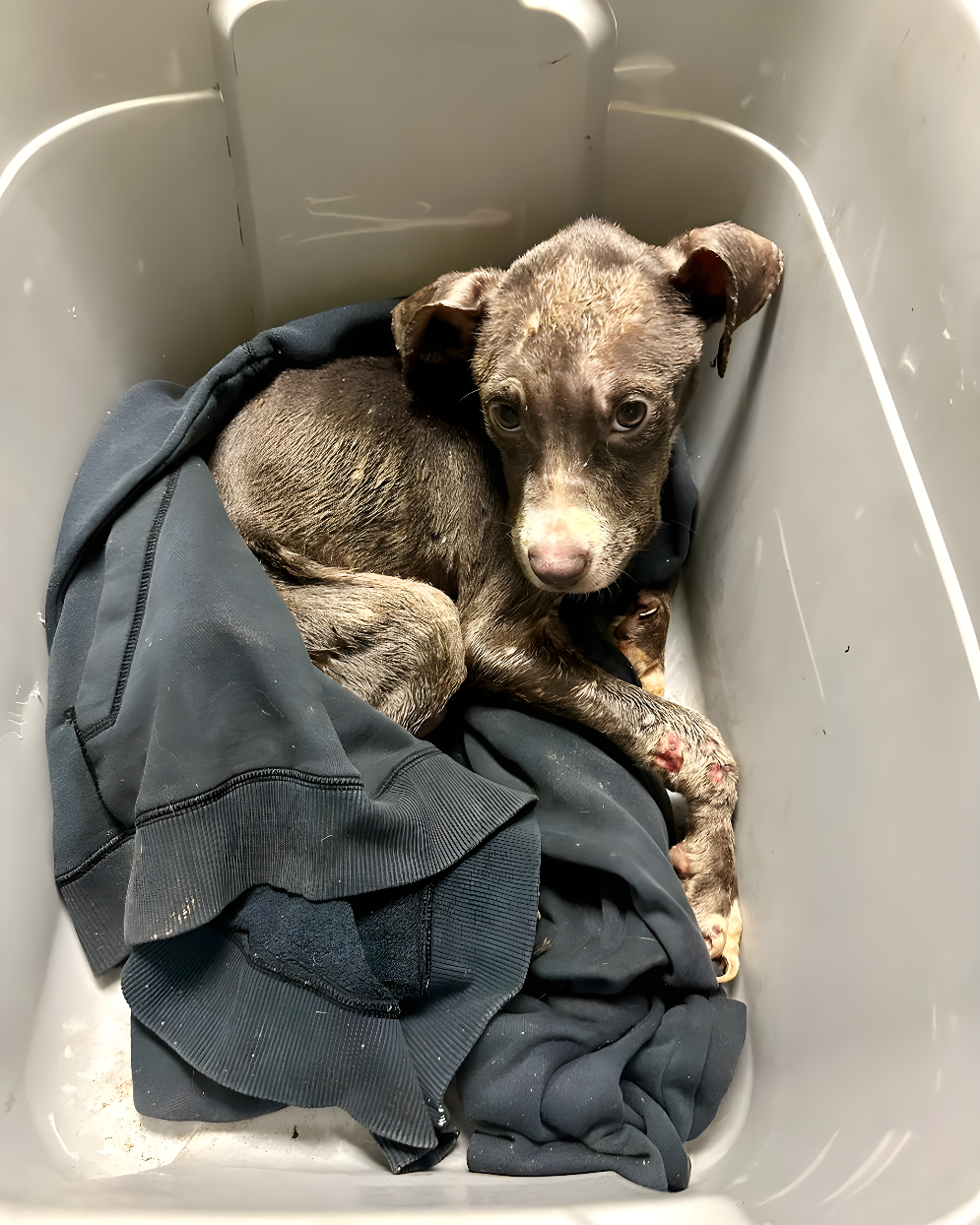 Этот щенок был обнаружен в глубокой яме, заполненной густым черным дёгтем и мусором. Его происхождение оставалось загадкой. Возможно, он потерялся, будто искал пищу, или его жестоко выбросили. Однако было одно очевидно: он подвергался невыносимым страданиям — в течение пяти-шести дней, как позже подтвердил ветеринар.