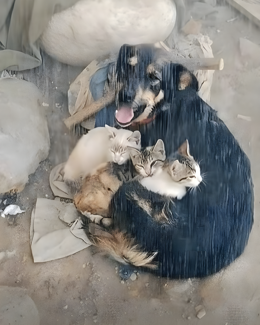 Все почалося одного дощового вечора, коли Лума натрапила на картонну коробку, сховану під покинутим будинком. Всередині тремтіли та жалюгідно нявчали три крихітні кошенята, покинуті та налякані. Багато хто просто пройшов би повз, можливо, через страх чи бажання захистити себе, але не Лума. Вона обережно підсунула коробку носом, немов намагаючись заспокоїти їх, а потім звилася навколо тремтлих тваринок, пропонуючи тепло, хоча сама ледве мала достатньо для себе. Очі кошенят мляво моргали, обережно зустрічаючи її погляд, відчуваючи несподівану доброту. В ту мить було укладено мовчазну угоду: вона буде піклуватися про них, а вони будуть довіряти їй.