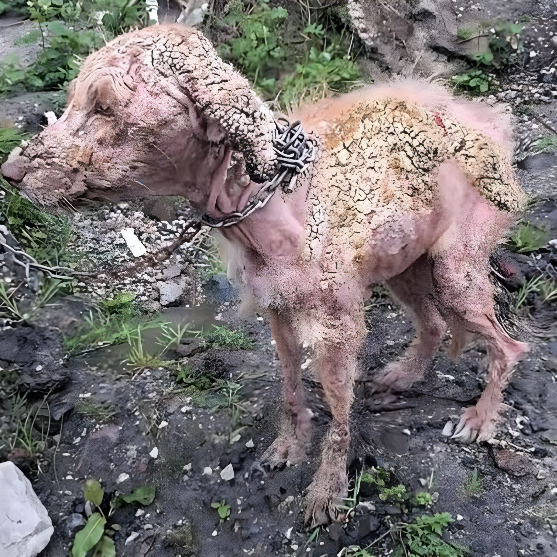 У центрі дворового простору, забитого землею та гравієм, одинокий і виснажений собака тихо лежав на сонці. Його тіло було оголеним, з потрісканою та відшарованою шкірою, і кожен його рух супроводжувався кров’ю, що лилася. Р rusty ціпок щільно обхоплював його шию, завдаючи нестерпного болю, легуючи до глибоких травм місцю. Кожний вдих супроводжувався тихим стогоном, ледь чутним, але сповненим величезної болі.